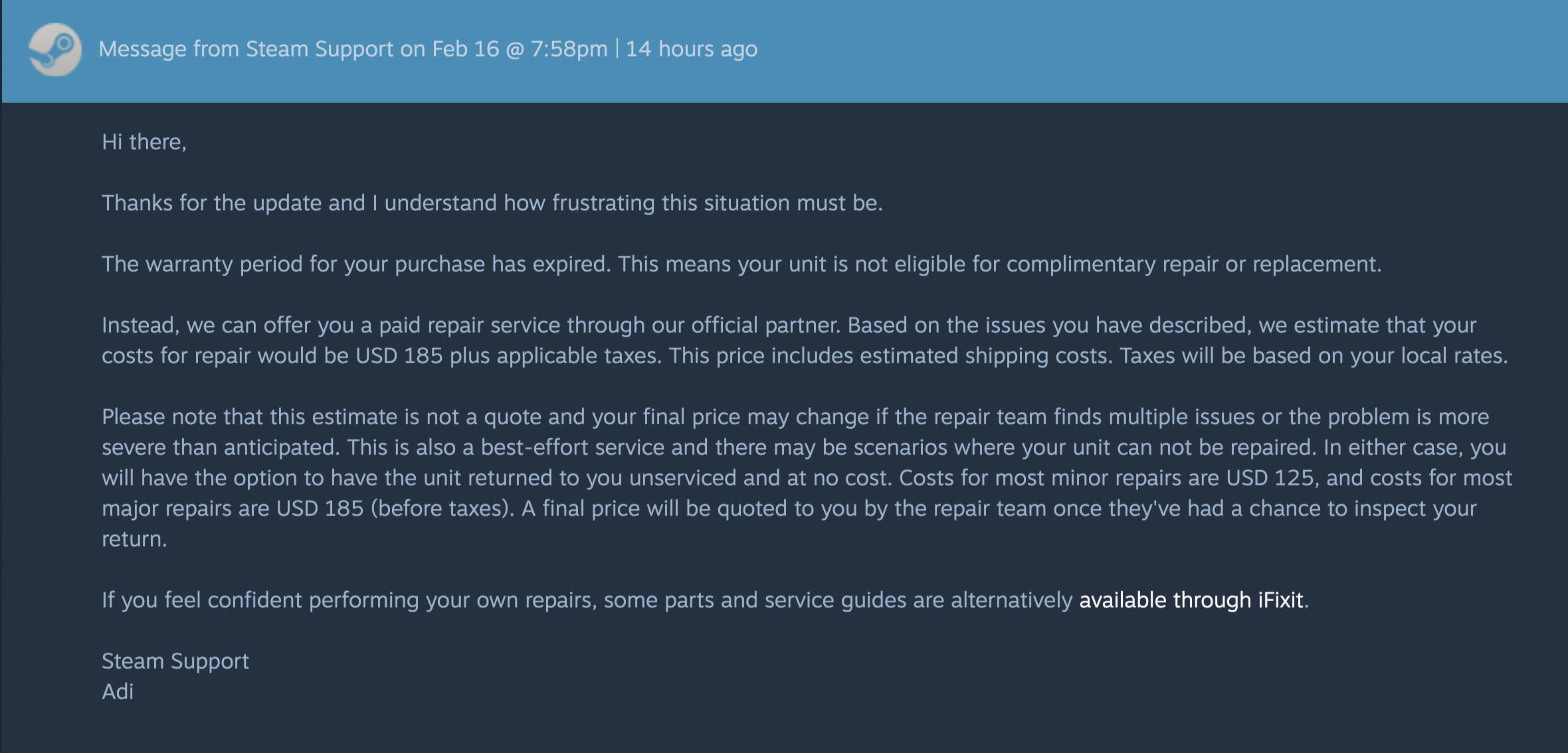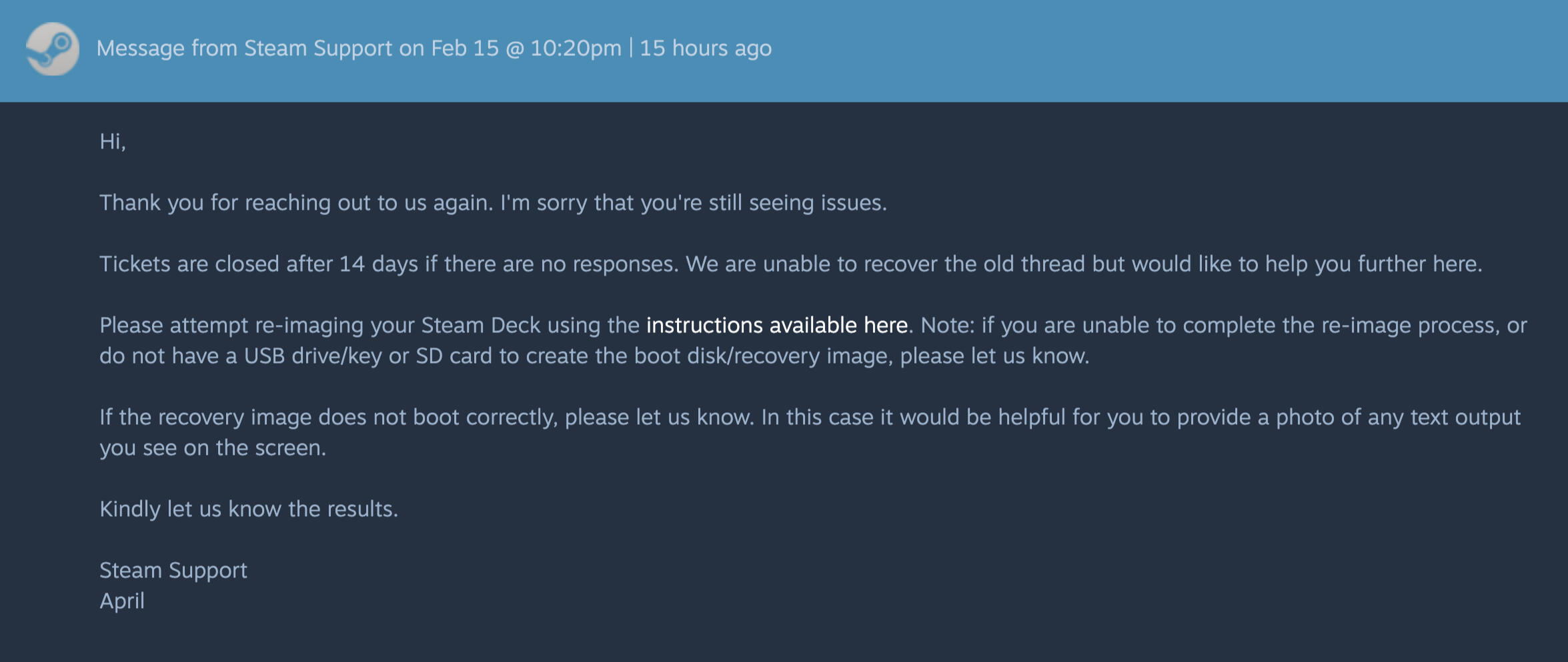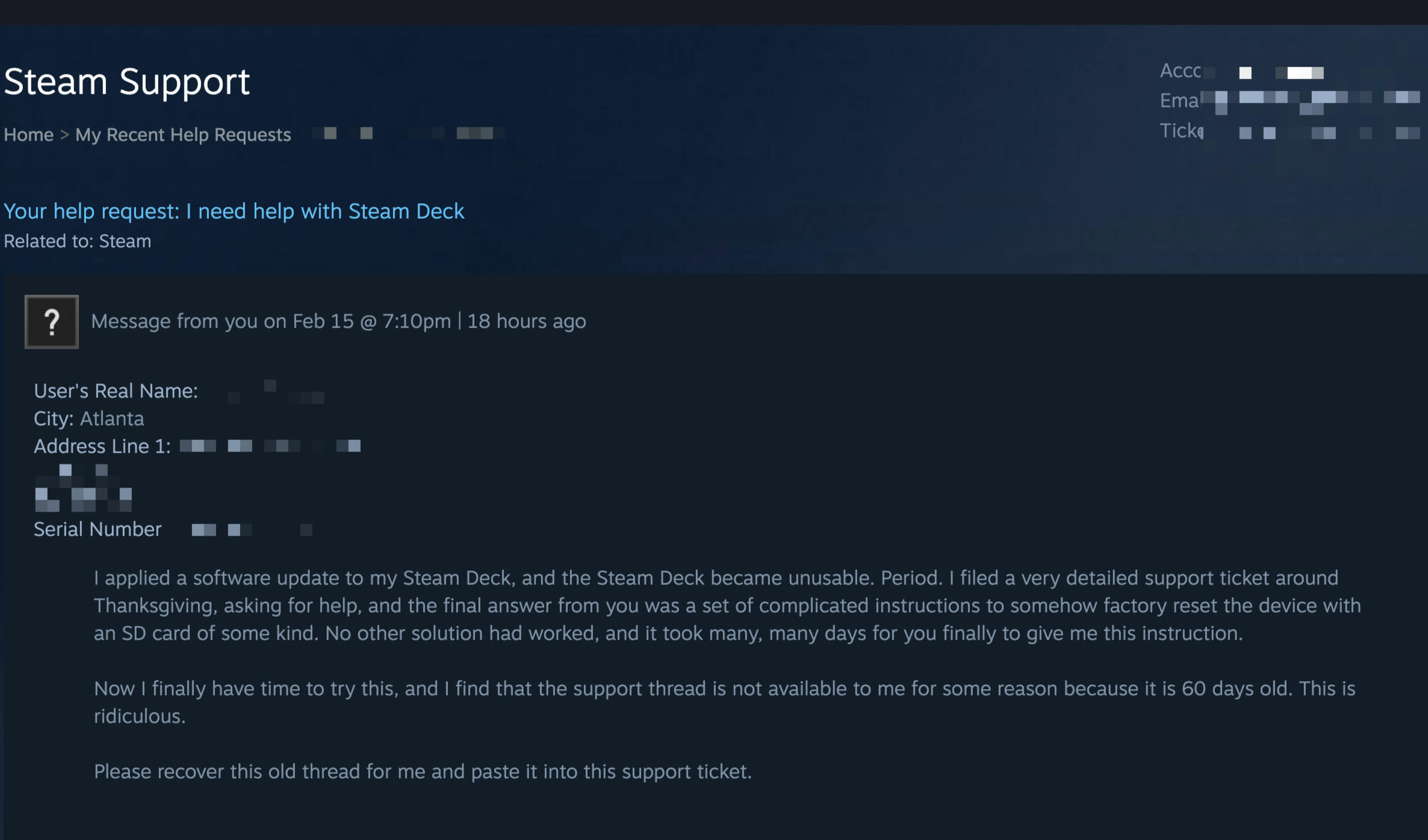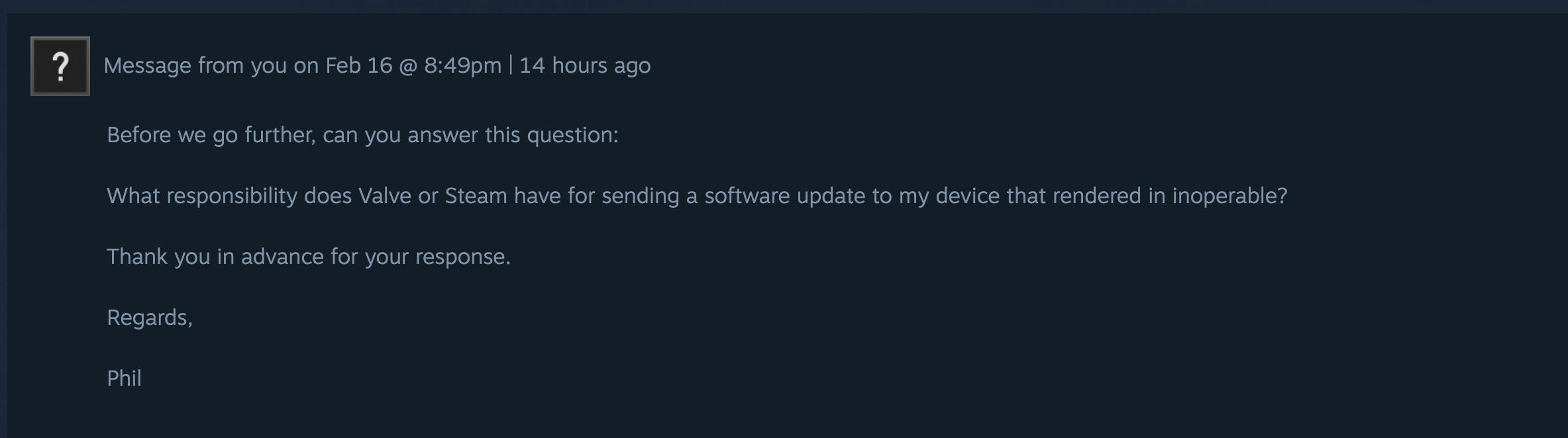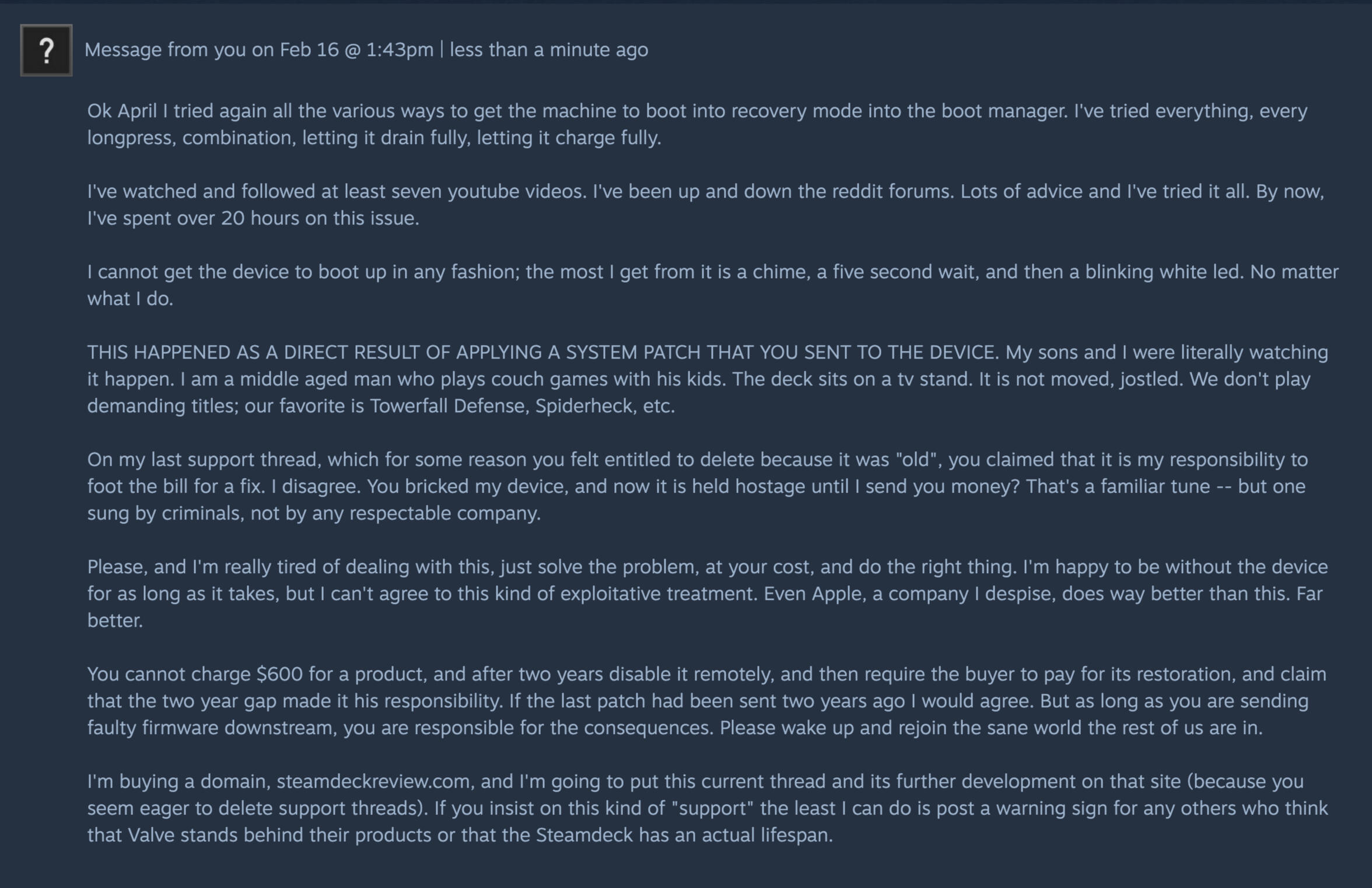 Valve / Steam bricked my deck. I don't think they are going to do a thing about it. All I can do is never give them another $0.01 of my money, and post this experience as a warning to others.Valve does not stand behind their hardware. The "black screen of death", as it is known, is a commmon and widespread issue. Do not buy from Valve